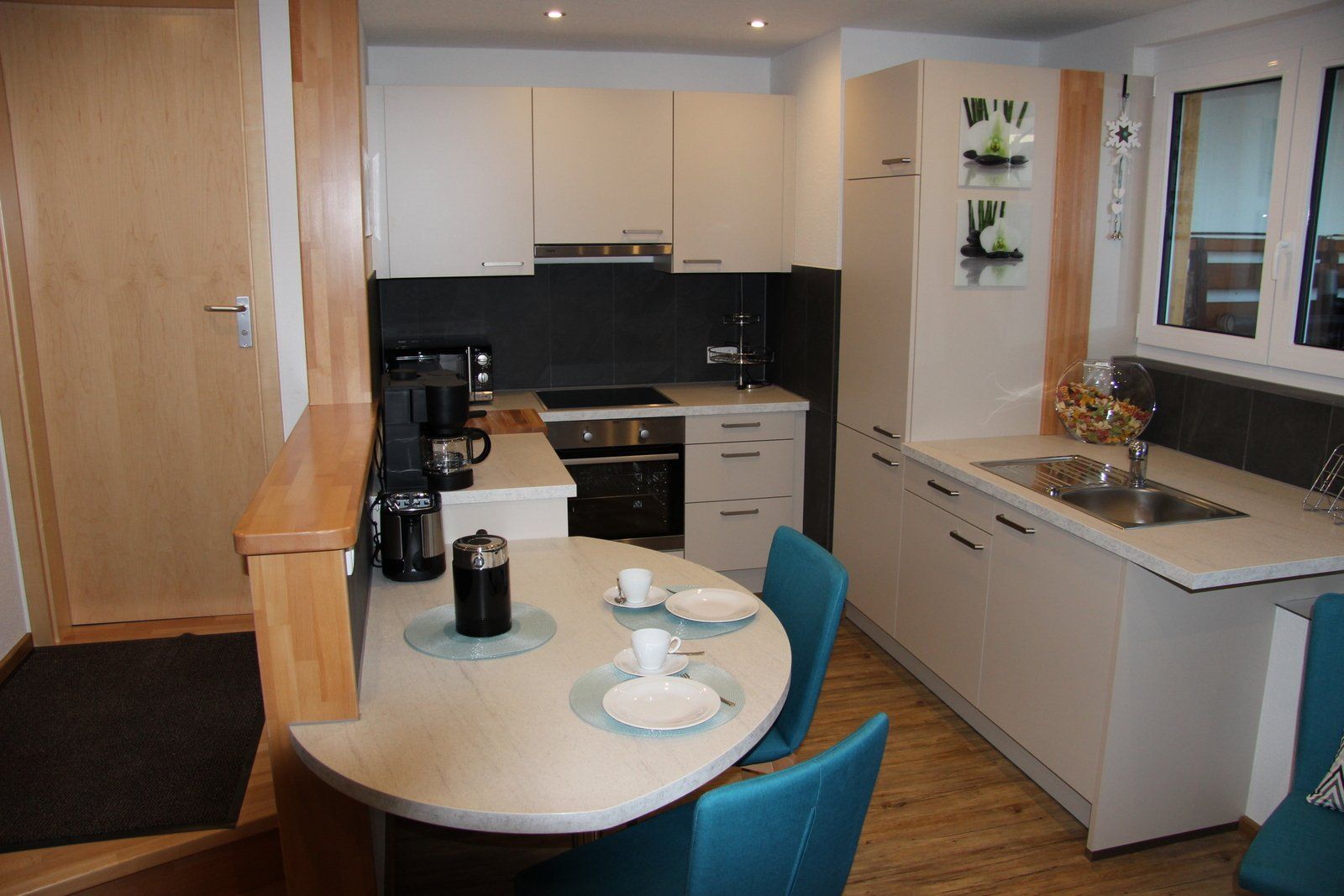 Küche mit Spülmaschine, 4 Platten Herd, Backofen, Mikrowelle, Kaffeemaschine und Toaster.